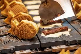 그럼 이 타이야키는 언제 시작이 되었느냐? 여러가지 가설이 있는데 그 중 1909년 메이지 시대에 도쿄에서 나니와야라는 가게를 운영하던 코베 세이지로라는 사람이 처음 개발 했다고합니다. 처음에는 다름 모양으로 팔았으나 잘 안되다가 도미 모양이 최종적으로 흥행하여 도미모양을 쭉 그대로 가게 되었다는 것입니다. 타이야키는 한국의 붕어빵보다 크기가 큰 편입니다. 반죽이 얇고 바삭하며, 안에 보통 팥이 있으나 요즘에는 다양한 소들이 들어가고 있습니다.